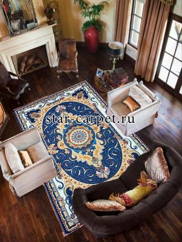 Ковер выполнен в классическом восточном стиле с богатым орнаментом. Центральная часть украшена сложным медальоном в виде звезды, окружённым деталями золотистых и синих тонов. Узоры включают в себя витиеватые линии, цветочные мотивы и элементы, напоминающие роскошные архитектурные арки. Глубокий синий цвет гармонично сочетается с золотыми и кремовыми акцентами, создавая атмосферу благородства и изысканности. Внешняя рамка обрамляет ковер, добавляя завершённости композиции.